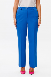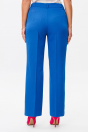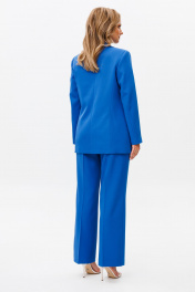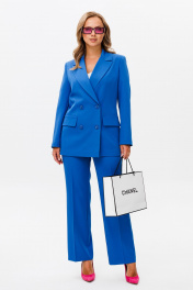 Костюм состоит из жакета и брюк. Жакет свободного силуэта, с двубортной с застежкой на четыре пуговицы. Перед с рельефом, с нагрудной вытачкой из горловины. По переду настрочены декоративные клапаны. Спинка со средним швом и рельефами. Рукав двухшовный втачной. Жакет на подкладке (Перед, спинка и рукав, состав подкладки: ПЭ-100%) Брюки прямые книзу, выполнные из костюмной ткани. Верх брюк на поясе со шлевками. В боковых частях пояса вставлена резинка. Застежка гульфик на молнии. В боковом шве карманы с наклонным входом. На брюках заутюжены стрелки. Фурнитура может быть изменена. Длина жакета 72 см, рукава - 60 см, длина брюк по боковому шву с учетом пояса - 104 см.