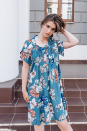 Платье трапециевидное из вискозы. Перед цельнокроеный, воротник - мягкая стойка, идущий на перед в завязывающийся бант. Спинка с талевыми вытачками. Рукав с не большим запахам по окату. Цвет морской волны с принтом. Длина изделия р.42-44 - 102 см, р.46-50 - 103 см, р.52-56 - 104 см Длина рукава р.42-44 - 11 см, р.46-50 - 12 см, р.52-56 - 13 см