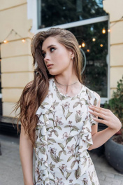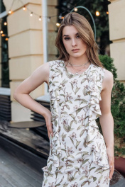 Летнее платье прилегающего силуэта. По переду фигурные рельефы и воланы по ним, по пинке рельефы и застежка молния потайная в среднем шве спинки Длина изделия р.42-44 - 92 см, р.46-50 - 95 см, р.52-56 - 100 см