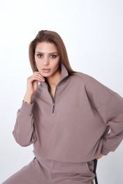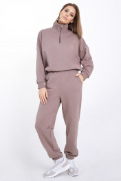 Стильный женский костюм спортивного стиля покроя оверсайз. Пошит из комфортной всесезонной ткани (петельного футера 3-нитки высшего качества пенье). Костюм состоит из свитшота и брюк. Свитшот свободного кроя со спущенной линией плеча и длинным рукавом. По центру переда короткая застежка-молния, переходящая в стойку. Низ свитшота дополнен кулисой и шнуром внутри для фиксации ширины изделия на уровне талии. Стойка, манжеты рукавов выполнены из ткани-компаньена кашкорсе. Слева на переде свитшота вышит логотип в цвет ткани. Брюки свободного прилегания, заужены к низу. Имеют притачной пояс с резинкой внутри, боковые карманы на передних половинках.. Низ брюк присобран на резинку. Длина свитшота: 58-60 см для роста 164-170 см, 60-62 см для роста 170-176 см; Длина рукава от горловины: 70-72 см для роста 164-170 см, 72-74 см для роста 170-176 см; Полуобхват груди: 66 см для 42 р., 68 см для 44 р., 70 см для 46 р., 72 см для 48 р., 74 см для 50 р., 76 см для 52 р. Длина брюк: 100-102 см для роста 164-170 см, 102-104 см для роста 170-176 см; Полуобхват бедер в брюках: 48 см для 42 р., 50 см для 44 р., 52 см для 46 р., 54 см для 48 р., 56 см для 50 р., 58 см для 52 р.