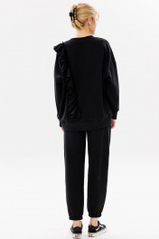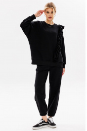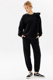 Современный, женственный костюм, покроя oversize из комфортной ткани (футера пенье). Костюм состоит из джоггеров и свободного свитшота с воланом. Волан с необработанным краем (укреплён строчкой для надежности) пришит асимметрично на левой стороне изделия. Свитшот имеет спущенную линию плеча, прямой силуэт и притачную манжету по низу изделия. По центру переда вышивка – логотип в цвет ткани. Рукава с притачной по низу манжетой. Бейка горловины, низ изделия и манжеты рукавов выполнены из ткани - компаньона кошкорсе. Брюки с притачным поясом, резинкой внутри. Передняя половинка брюк с удобными боковыми карманами. Низ брюк присобран на резинку. Длина свитшота по спинке 70-73 см. Длина рукава от горловины 72-74 см для роста 164-170 см, 74-76 см для роста 170-176 см. Полуобхват груди в свитшоте: 42 р. - 69 см, 44 р. - 71 см, 46 р. - 73 см, 48 р. - 75 см, 50 р. – 77 см, 52 р. – 79 см. Длина брюк по боковому шву с поясом: 99-102 см для роста 164-170 см, 102-104 см для роста 170-176 см. Полуобхват бедер: 42 р. - 49 см, 44 р. - 51 см, 46 р. - 53 см, 48 р. - 55 см, 50 р. – 57 см, 52 р. – 59 см.