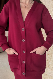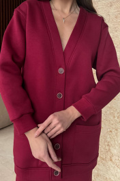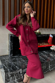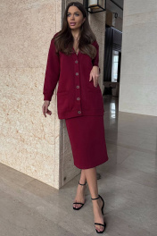 Современный женственный комплект, состоит из кардигана и прямой юбки. Кардиган имеет прямой силуэт и длинные рукава с мажетами (из ткани кошкорсе). Вырез горловины Y-образной формы с притачной планкой. Застежка по центру переда на петли и пуговицы. На переде удобные карманы. По планкам, по карманам, проложена отделочная строчка. Юбка зауженная к низу, облегающая фигуру, длиной миди. В среднем шве спинки разрез. Пояс из ткани кошкорсе, с резинкой внутри. Длина кардигана: 76-79 см. Длина рукава от горловины: 64-66 см для роста 164-170 см, 66-68 см для роста 170-176 см. Полуобхват груди джемпера: 42 р -56 см, 44 р - 58 см, 46 р. - 60 см, 48 р. - 62 см, 50 р. - 64 см, 52 р. - 66 см, 54 р - 68 см, 56 р - 70 см, 58 р - 72 см. Длина юбки с поясом: 77-79 см. Полуобхват бедер юбки: 42 р - 46 см, 44 р - 48 см, 46 р. - 50 см, 48 р. - 52 см, 50 р. - 54 см, 52 р. - 56 см, 54 р - 58 см, 56 р - 60 см, 58 р - 62 см.