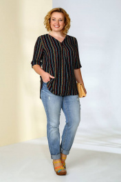 Блузка с V-образным вырезом горловины. По переду с встречной складкой посередине детали. Спинка цельная. Линия низа фигурная. Силуэт: прямой Вид покроя рукава: втачной, короткий, с патой по низу, зафиксированной к рукаву петлей и пуговицей. Цветовая гамма для верха, подкладки, фурнитуры, отделки: блузка из неэластичной ткани с рисунком. Отделочные строчки в тон ткани. Фурнитура контрастна основной ткани. Длина изделия: 71 см Длина рукава: 37 см