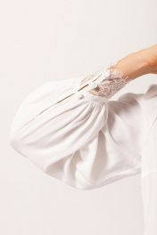 Блузка с отрезным воротником- стойкой, центральной застежкой на петли и пуговицы. По переду с нагрудными вытачками. Рукав втачной, длинный, с отрезной манжетой, застегивающейся на три навесные петли и пуговицы.
