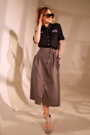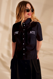 Описание внешнего вида: блузка с центральной застежкой на петли и пуговицы, втачным воротником с отрезной стойкой. По переду с накладными карманами с клапанами. Спинка с отрезной кокеткой. Кокетка спинки, переходящая на перед. Низ блузки фигурный. Силуэт: прямой Вид покроя рукава: втачной, короткий, с отложной манжетой. Цветовая гамма для верха, подкладки, фурнитуры, отделки: блузка из эластичной ткани в одной цветовой гамме. Клапаны декорированы печатью.