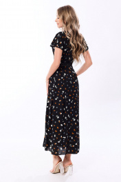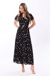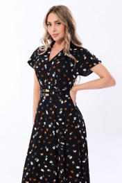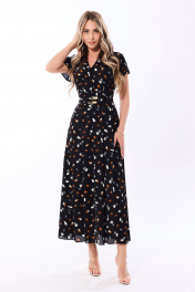 Платье c отложным воротником и лацканами, втачным широким поясом, застежкой на потайную молнию в левом боковом шве. Верхняя часть платья с кокеткой переда и спинки. Верхняя часть переда с имитацией застежки, односторонними складками по шву притачивания кокетки и пояса, верхняя часть спинки с односторонними складками по шву притачивания пояса. На втачном поясе расположены шлевки для двух съемных поясов. Нижняя часть переда и спинки с четырьмя односторонними складками по шву притачивания пояса. Платье без рукавов , со спущенным плечом. На кокетке платья расположена декоративная пата, закрепленная по плечу тремя пуговицами. Платье со съемными поясами. Платье на подкладке по нижней части.