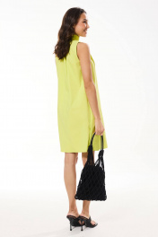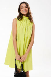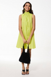 Платье расширенного к низу силуэта, с отрезным воротником- стойкой, застежкой на две навесные петли и пуговицы по стойке спинки. Стойка горловины с параллельными односторонними складками. По горловине переда- сборка. Спинка со средним швом. Платье без рукавов. Цветовая гамма для верха, подкладки, фурнитуры, отделки: платье из ткани в одной цветовой гамме.