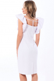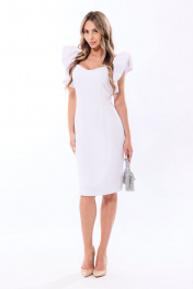 Платье, с застежкой на потайную молнию в среднем шве спинки, без воротника, с фигурным вырезом горловины. По переду с рельефами, выходящими из горловины. Рукав втачной, короткий, двойной, присборенный на резинку по шву втачивания. Окат рукава со сборкой. По спинке- декоративный шнур- завязка. Платье без подкладки.