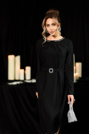 Платье без воротника, с фигурным вырезом горловины, застежкой на потайную молнию в среднем шве спинки. Платье отрезное по линии талии. По горловине переда фигурная драпировка со складками, горловина переда с отрезной планкой, декорированной тесьмой со стразами. Спинка со средним швом, заканчивающимся разрезом, талиевыми вытачками. Рукав втачной, длинный. Платье со съемным поясом. Силуэт: полуприлегающий