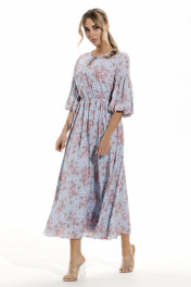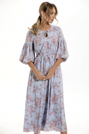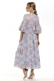 Описание внешнего вида: платье без воротника, с круглым вырезом горловины, капелькой по горловине переда и завязками, отрезное по талии, шов по талии присборен резинкой. По лифу переда нагрудные вытачки. Лиф спинка цельный. Рукав втачной 7/8, отрезной манжетой, присборенной на резинку. Рукав состоит из двух частей, шов притачивания нижней части присборен. Платье на подкладке. Вид покроя рукава: Рукав втачной, 7/8. Цветовая гамма для верха, подкладки, фурнитуры, отделки: платье из ткани с цветочным рисунком.