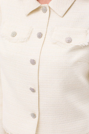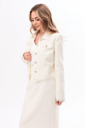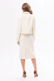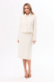 Жакет с центральной застежкой на петли и пуговицы, с отложным воротником. По переду с нагрудными вытачками. На уровне линии груди расположены клапаны с бахромой из основной ткани. Спинка со средним швом. По низу спинки и полочек бахрома из основной ткани. Рукав втачной, длинный. По низу рукава бахрома из основной ткани. Юбка без пояса. Верхний срез обработан обтачками. Застежка на потайную молнию в среднем шве спинки. Заднее полотнище со средним швом, заканчивающимся шлицей По переднему полотнищу на уровне линии бедер- клапаны с бахромой из основной ткани. Жакет, юбка на подкладке. жакет, юбка на подкладке
