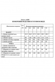 Жакет с центральной застежкой на петли и пуговицы, отложным врортником. По переду с нагрудными вытачками. По спинке со средним швом и талиевыми вытачками. Рукав втачной, длинный. Юбка с отрезным поясом, застежкой на потайную молнию по среднему шву заднего полотнища. По переднему полотнищу односторонний рельеф с разрезом. Задняя половинка со средним швом, талиевыми вытачкам. В области спинки пояс присборен на резинку.