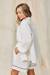 Блузка с центральной застежкой на петли и пуговицы, втачным воротником с отрезной стойкой На левой полочке-накладной карман, расположенный на уровне груди. Спинка с отрезной кокеткой, бантовой складкой, расположенной по шву притачивания кокетки. Плечо спущенное. Рукав втачной, длинный, с отрезной манжетой, застегивающейся на две петли и пуговицы. Шорты с отрезным поясом. Пояс присборен на резинку. Низ шорт с отрезными манжетами. В боковых швах расположены карманы. По шву притачивания манжет шорт, низу манжет рукавов, - втачной кант , контрастный основной ткани. Силуэт: прямой Вид покроя рукава: втачной Цветовая гамма для верха, подкладки, фурнитуры, отделки: комплект выполнен из ткани в одной цветовой гамме. Тип ткани: текстильный, костюмно – плательный Комплектация: блузка, шорты