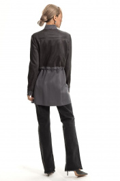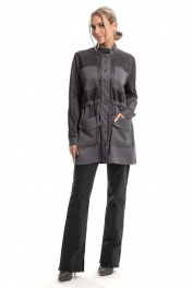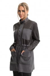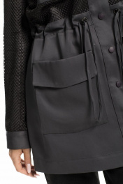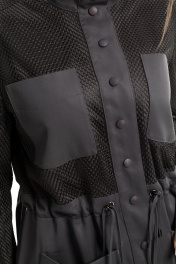 Описание внешнего вида: Куртка с центральной застежкой на кнопки, по линии талии- кулиса со шнуром- завязкой.На уровне линии груди расположены накладные карманы. На уровне линии бедер- накладные карманы с цельнокроенными клапанами. Спинка с отрезной кокеткой, линия плеча переходящая на перед. Рукав втачной, длинный, с отрезной манжетой. Силуэт: прямой Вид покроя рукава: втачной, длинный Цветовая гамма для верха, подкладки, фурнитуры, отделки: куртка из ткани в одной цветовой гамме. Верхняя часть переда, спинки и рукава двухслойные, верхний слой- сетка в тон основной ткани. Комплектация: куртка без подкладки