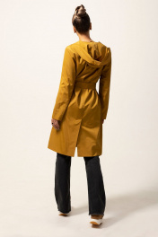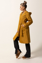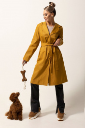 Плащ с центральной застежкой на пришивные кнопки, втачным капюшоном и отложными лацканами. По переду с прорезными карманами с листочками.. Спинка со средним швом. По низу рукавов- цельнокроенные отложные манжеты. Плащ на подкладке.