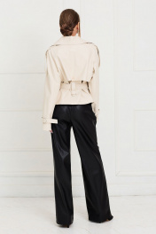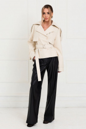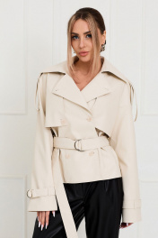 куртка с центральной двубортной застежкой на петли и пуговицы, втачным воротником с отрезной стойкой. По переду с отлетными кокетками, рельефами, выходящими из плеча. Спинка со средним швом, отлетной кокеткой, средним швом. Рукав длинный, реглан. По плечевым швам и низу рукава- паты со шлевками. Куртка со сьемным поясом. Силуэт: прямой. Вид покроя рукава: реглан Цветовая гамма для верха, подкладки, фурнитуры, отделки: куртка выполнена из ткани-кожзам куртка на подкладке