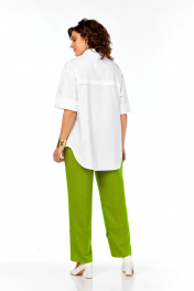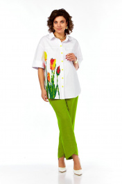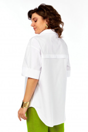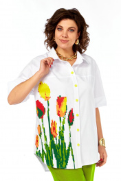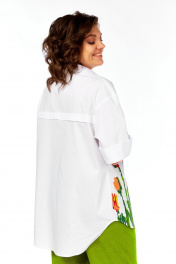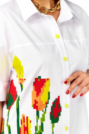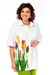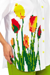 Рубашка женская , со спущенным плечом, прямого силуэта, с застежкой на петли и пуговицы. Перед с кокетками, с правой стороны переда расположена дизайнерская печать. Спинка с отрезной кокеткой и складкой. Воротник стояче-отложной. Рукава по локоть, низ рукава обработан манжетой. Низ изделия неровный.