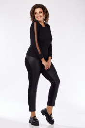 Жилет прямого силуэта со спущенным плечом, с широкой манжетой 7 см по низу. Без подкладки, без застежки. По спинке есть отделочная деталь шириной 7 см. Горловина жилета обработана довязом. Джемпер прилегающего силуэта, с длинным рукавом, с манжетой по низу. В рукаве есть отделочная деталь из сетки шириной 3 см. Джемпер без подкладки. Горловина обработана бейкой шириной 2 см. Брюки прилегающего силуэта на поясе с резинкой шириной 4 см без карманов. Задняя часть брюк с отрезными кокетками (одна трикотажная, вторая кожаная). Задняя часть брюк выполнена из трикотажа, передняя часть брюк выполнена из кожи с одной отрезной трикотажной кокеткой. Боковой шов брюк переведен на перед.Брюки укорочены. Модель подходит на рост не выше 164 см