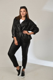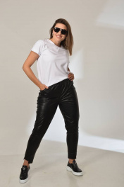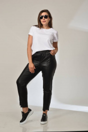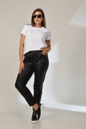 Брюки из эко кожи , слегка укороченные с фигурным ступенчатым низом. По передним половинкам брюк рельефы с отделочными строчками в цвет брюк. Имитация застёжки по центру переда. На задних половинках брюк накладные карманы фигурной формы с вытянутым углом. Пояс на широкой резинки в круговую. Брюки также могут быть дополнены курткой м.2017 из такой же ткани .