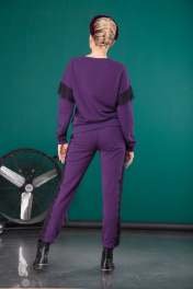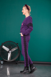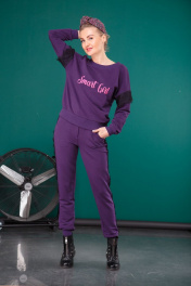 Костюм выполнен из футера трехнитки, без стрейча, но как и любой трикотаж имеет механическое растяжение. Свитшот свободного прилегания с надписью "smart girl" что в переводе означает "умница", плечо приспущено, переход на рукав украшен кружевом, которое так же украшает и боковые швы брюк в виде лампасов. В пояс брюк вставлена резинка и декоративная лента для дополнительной стяжки, по бокам карманы. Длина брюк по боковому шву с манжетой 102+-1см., по внутренней стороне 80см. Длина свитшота по спинке 54+-1см., длина рукава от горловины 69+-1см.