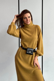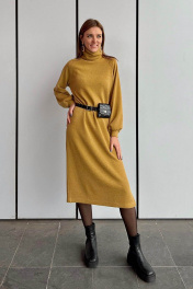 Платье женское трикотажное с ремнем, с рукавом реглан с притачным манжетом. Высокий отлажной воротник, длина ниже колена, разрез по боковому шву с левой стороны. Ремень съемный из экокожи. Цвет: горчица