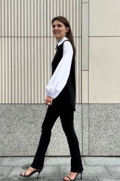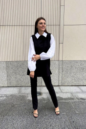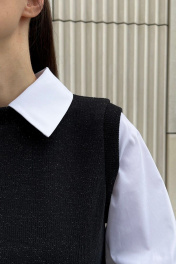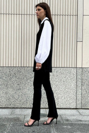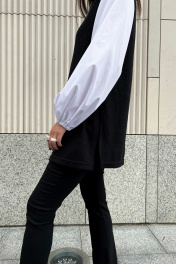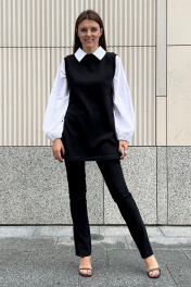 Туника женская свободного кроя, горловина обработана воротником из отделочной ткани, по низу в боковых шках разрезы. Рукава свободного кроя из отделочной ткани, низ рукава на резинке. Смежные размеры. Длина - середина бедра.