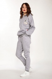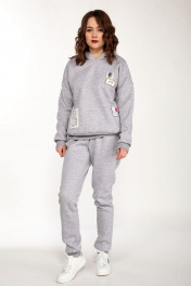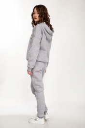 Комплект женский двухпредметный выполнен из трикотажной ткани с начесом состоит из худи и брюк. Худи свободного силуэта, со спущенным рукавом, с капюшоном, манжет и низ худи обработан довязом. Брюки полуприлегающего силуэта на резинке с карманами, с притачными манжетами из довязов по низу. Длина брюк с манжетом 115 см, длина худи по спинке 68 см.