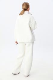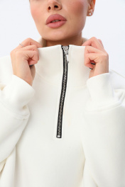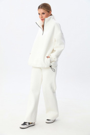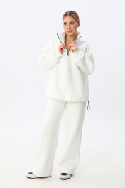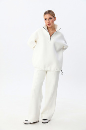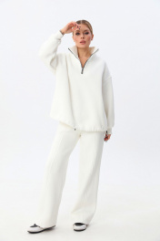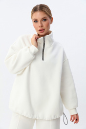 М-120. Женский джемпер выполнен из трикотажного полотна с начёсом. Джемпер прямого свободного покроя оверсайз со спущенной линией плеча. Рукав притачной, одношовный, объёмный, с резинкой-довязом по низу. Воротник-стойка с застёжкой по центру переда на тесьму-молнию длиной 25 см. Ширина джемпера по низу регулируется с помощью резинки-жгута и двух фиксаторов, расположенных в подгибке низа. В боковых швах обработаны удобные карманы в шве.
