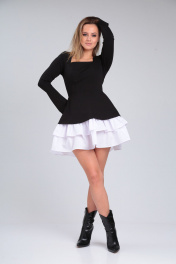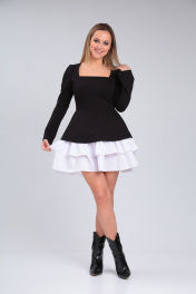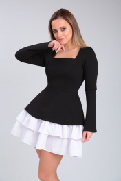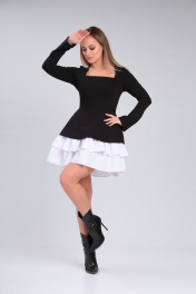 Платье прилегающего силуэта с втачным рукавом. Спинка удлиненная на молнии. Лиф платья с рельефами выходящими из проймы. Горловина платья обработанна вырезом каре. Юбка платья со сьемным Рост модели 170см. Длина платья 89см. воланом, фиксируемый на тесьме с кнопками. Платье возможно носить без волана как тунику.