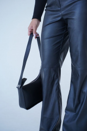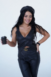 Брюки из искусственной кожи. Трендовые брюки из экокожи - плотного, но при этом эластичного материала, Модель расклёшенного кроя с высокой посадкой и застёжкой-«молнией» скрытой гульфиком. Дополнена шлёвками для ремня, двумя боковыми карманами с отрезным бочком и накладными карманами сзади. Данная модель брюк визуально удлинит ноги, сделает бёдра более узкими и скроет недостатки.Ухаживать за изделиями из экокожи одно удовольствие. Ткань легко отмывается от пятен, не выгорает на солнце, что делает её практичной в носке. В таких брюках, будет комфортно в любую пору года, они легко впишутся в Ваш гардероб и станут неотъемлемой базой в стильных образах. Женский жилет корп- топ из экокожи. Стильный женский жилет из плотной, эластичной, искусственной кожи - ставшей трендом этого сезона. Отличительной чертой жилета стала нестандартная геометрия образа и необычный конструктивный крой. Ряд чёрных, матовых кнопок имитирует запах. Широкие бретели разгружают плечи и спину женщины, заботясь о её комфорте, а V-образный вырез делает правильный акцент. Разделительный шов поднимает линию талии, а симметричный вырез по низу жилета, создаёт эффект песочных часов, визуально удлиняя и стройся фигуру. Жилет(корп-топ) легко сосчитается с футболками, рубашками, водолазками, жакетами, помогая создавать многослойные образы. Он несомненно станет самым стильным и универсальным элементом одежды в Вашем гардеробе. Рост модели 164.Длина брюк 110 длина жилета 45