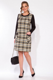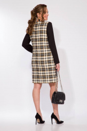Элегантное платье в стиле chanel. Модель прямого силуэта, выполнено из рогожки с рисунком в клетку в расцветке 3-колор: горчица, молочный, черный. Горловина округлой формы на планке, со вставкой из жемчужной ленты. По полочке расположены 2 накладных кармана с декоративными элементами в виде бусин из жемчуга в оттенке «антик». Рукав вточной, длинный, выполнен из трикотажа. Спинка прямая с таллиевыми выточка. Застежка – потайная тесьма-молния в среднем шве спинки. Длина 100 см. Рукав – 63 см.