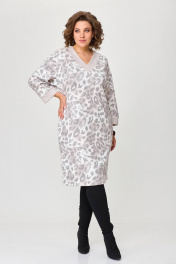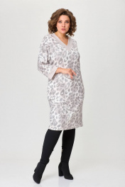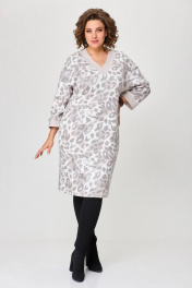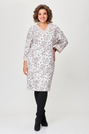 Платье свободного силуэта, изготовлено из трикотажа. Вырез горловины -V-образный, рукав спущенный 7/8-х. В боковых швах – карманы. Изделие без застежки. Длина рукава – 39см, ширина плеча – 26см, длина изделия – 104см
