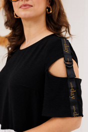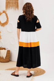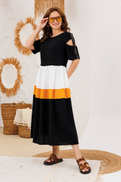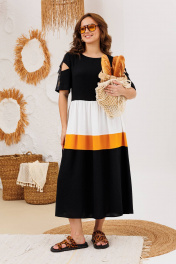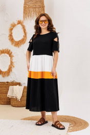 Платье свободного силуэта, вырез горловины округлый. Рукав втачной с декоративным элементом в виде прорези с тесьмой. В боковых швах карманы. Изделие без застежки и без подкладки. Р-р 50: Длина рукава – 27 см, длина изделия – 124см.