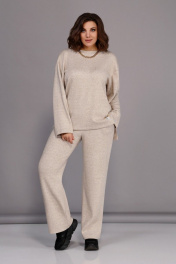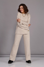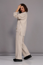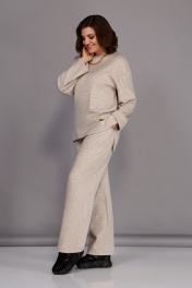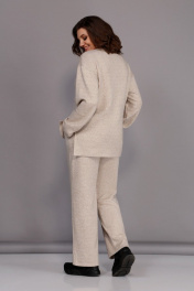 Костюм брючный 2-ка, выполнен из мягкого приятного к телу трикотажа. Костюм состоит из джемпера и прямых брюк. Джемпер прямого свободного силуэта со спущенной линией плеча, округлым вырезом горловины, по боковым швам - разрезы, слева внизу пришит декоративный элемент. Рукава втачные, прямые. Спинка джемпера без конструкционных измененией. Линия низа спинки длиннее линии низа переда на 7см. Брюки прямого свободного силуэта с наклонными карманами в боковых швах. Пояс брюк на широкой резинке. длина джемпера - 76см, длина рукава - 56см, ширина плеча - 19см, длина брюк - 105см