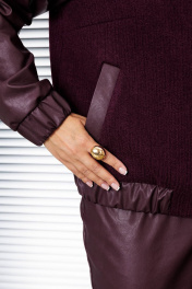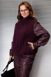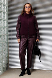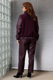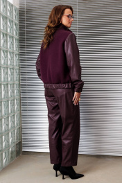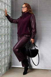 Комплект двойка состоящий из жакета и брюк. Жакет-бомбер свободного силуэта, выполнен в сочетании из двух тканей, горловина - стойка. Рукав втачной, на резинке по низу. По переду карманы с листочкой, по низу жакет на резинке. Застежка на тесьму-молнию. Изделие на подкалке. Брюки -бананы, выполнены из кожи на хлопке, по талии частично на резинке. В боковых швах карманы и накладные по заднему полотнищу. Застежка на тесьму-молнию. Р-р 50: Длина рукава жакета – 61см, длина жакета – 60 см Длина брюк – 103,5см