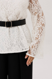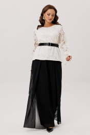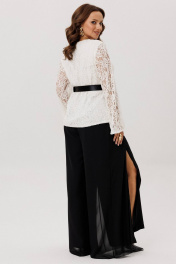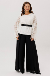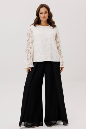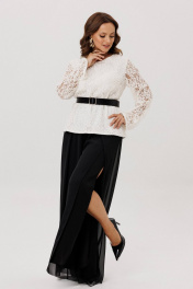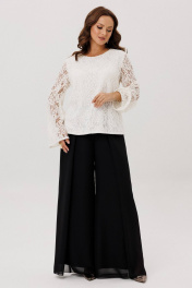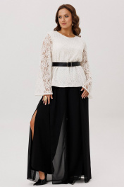 Комплект двойка состоящий из блузки и брюк. Блузка полуприлегающего силуэта, вырез горловины округлый, рукав втачной-клеш. Изделие на подкладке, без застежки. Брюки -палаццо двойные. По талии на резинке, по переду складки и разрезы. Без карманов. Застежка на тесьму молнию по переду.