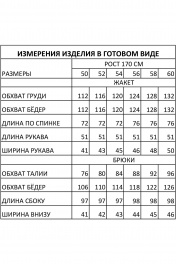 Костюм женский полуприлегающего силуэта, состоящий из жакета и брюк, выполнен из костюмной ткани с добавлением вискозы 63%. Жакет без подкладки, по переду которого функциональные накладные карманы; воротник пиджачного типа; рукава со спущенной линией плеча, внутренней патой и манжетой, что позволяет регулировать высоту рукава и представляет собой стильную деталь с изысканным акцентом; линия низа фигурной формы; застежка на петли и пуговицы. По переду брюк декоративная отделочная строчка; по низу функциональная пата с пуговицей, которая позволяет регулировать прилегание брюк; в боковых швах карманы; по поясу спинки вставлена резинка; застежка на молнию, петлю и пуговицу. Костюм полностью соответсвует заявленному размеру. Пользуйтесь таблицей замеров готового изделия. Уход за натуральными тканями: - рекомендована бережная стирка притемпературе не выше 30 градусов; - глажение при температуре прессующей поверности 110 градусов. длина жакета в базовом размере, см 72 (размеры 50-54), 76 (размеры 56-60) длина брюк в базовом размере, см 97 (размеры 50-54), 98 (размеры 56-60)