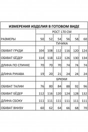 Костюм женский, состоящий из туники и брюк, выполнен из легкой струщейся ткани. Туника свободного силуэта со втачными рукавами; линия горловины с V-образным вырезом и контрастным довязом. Брюки классические, прямого кроя, в боковых швах функциональные карманы, пояс притачной полностью на резинке. Костюм полностью соответсвтует заявленному размеру. Пользуйтесь таблицей замеров готового изделия. Уход за натуральными тканями: - рекомендуется бережная стирка при температуре 30 градусов; - глажение при температуре прессующей поверности не выше 110 градусов.