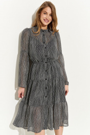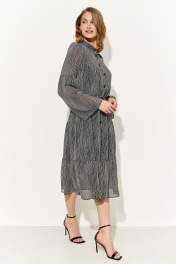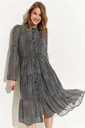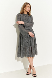 Платье женское полуприлегающего силуэта из шифона на подкладке. Перед платья с нагрудными вытачками; по линии талии вставлена резинка; юбка изделия украшена тремя воланами с небольшой сборкой; рукава втачные с аккуратной сборкой по окату и по отрезной части рукава. Верхняя часть платья имеет подкладку в виде топа на регулируемых бретелях, что обеспечивает комфортную посадку; нижняя часть подкладки - отлетная. Застежка-планка на петли и пуговицы. Платье полностью соответствует заявленному размеру. Пожалуйста, пользуйтесь таблицей замеров готового изделия, чтобы подобрать идеальный размер. Уход за шифоном: - при стирке в стиральной машине выбрать бережный либо деликатный режим, - температура воды не выше 30 градусов; - рекомендована химчистка.