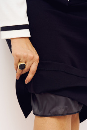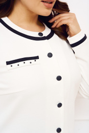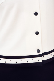 Костюм женский, состоящий из жакета и юбки. Жакет полуприлегающего силуэта из трикотажа средней плотности выполнен частично на подкладке; рукава втачные; по переду декоративная листочка; застежка на петли и пуговицы. По горловине, листочке, низу жакета и рукавов - декор из ткани контрастного цвета с добавлением пробивных бусин. Юбка полуприлегающего силуэта на эластичной подкладке с притачным поясом, в боковые швы которого вставлена резинка для лучшего прилегания; по спинке шлица; застежка на молнию, петлю и пуговицу. Костюм прошел тестовую стирку при t 30 С - не линяет. Рекомендована бережная стирка при t не выше 30, глаженье при максимальной температуре прессующей поверхности утюга не более 110 C.