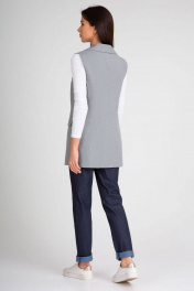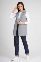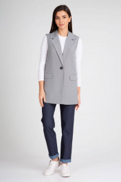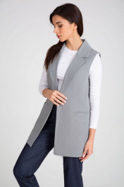 Удлиненный жилет полуприлегающего силуэта с однобортной застежкой на пуговицу. Отложной воротник с лацканами. Жилет с боковыми рельефами, спинка со средним швом. Спереди горизонтальные боковые карманы в рамку, с клапанами. Жилет на подкладке.