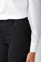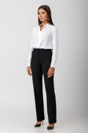 Прямые классические брюки со стрелками. Притачной пояс со шлевками. Средняя посадка на талии. Застежка на молнию и две пуговицы. Спереди косые боковые карманы с декоративной планкой и закрепками. Спинка с кокеткой и имитацией карманов с фигурными листочками.