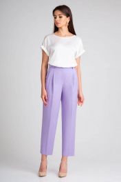 Свободные укороченные брюки со стрелками. Выполнены из эластичного полотна на основе хлопка. Высокая посадка на талии, притачной пояс со шлевками. Застежка на молнию и пуговицу. Спереди в шов пояса заложены симметричные складки. Центральные складки переходят в стрелки. Спереди косые боковые карманы. Сзади имитация горизонтальных карманов с листочкой.