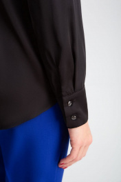 Блузка свободного силуэта, из искусственного шелка с атласным блеском. Отложной воротник-стойка. Центральная застежка на декоративные пуговицы. Слегка спущенная линия плеча с притачными рукавами на манжетах, с застежкой на декоративные пуговицы. Спинка с кокеткой. Передние полочки и спинка по низу с плавным закруглением.