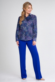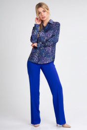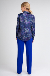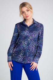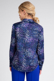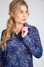 Блузка свободного силуэта, из полотна с матовым атласным блеском, с декоративным принтом "птички". Отложной воротник-стойка. Центральная застежка на декоративные пуговицы. Слегка спущенная линия плеча с притачными рукавами на манжетах, с застежкой на декоративные пуговицы. Спинка с кокеткой. Передние полочки и спинка по низу с плавным закруглением.