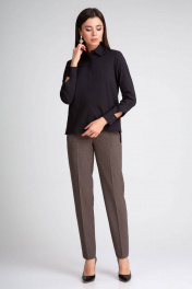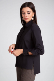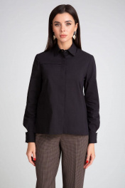 Рубашка прямого силуэта, с центральной застежкой на пуговицы в потайной планке. Отложной воротник-стойка. Передняя правая полочка с декоративной горизонтальной планкой. Притачные рукава с декоративным фигурным вырезом, на высокой манжете с застежкой на пуговицы. Спинка длиннее переда, боковые швы заканчиваются разрезами. Спинка из двух частей с декоративной горизонтальной планкой.
