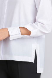 Рубашка прямого силуэта, выполнена из полотна на основе хлопка. Центральная застежка на пуговицы в потайной планке. Отложной воротник-стойка. Передняя правая полочка с декоративной горизонтальной планкой. Притачные рукава с декоративным фигурным вырезом, на высокой манжете с застежкой на пуговицы. Спинка из двух частей, с декоративной горизонтальной планкой. Спинка длиннее переда, боковые швы заканчиваются разрезами.