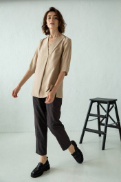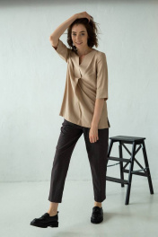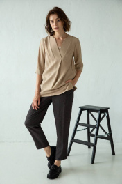Свободная блузка с V-образной горловиной плавно переходящей в декоративную складку. Рукава средней длины. Боковые швы блузки заканчиваются невысокими разрезами 10 см. Блузка, выполненная из ткани с эффектом "жатки" с добавлением натуральных волокон, станет комфртным и стильным вариантов для повседневных образов.