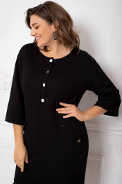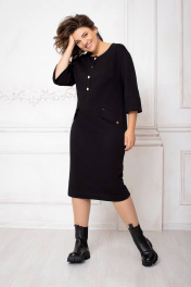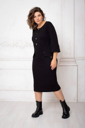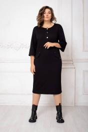 Платье полуприлегающего силуэта, длиной ниже колена. Спинка с талиевыми вытачками. Перед платья с нагрудными вытачками и отделочными клапанами, на которых пришиты декоративные пуговицы. По лифу переда обработана застёжка на петли и пуговицы, которая заканчивается чуть выше уровня талии. Горловина округлой формы. Линия плеча спущена, рукава одношовные, втачные, длиной ¾, слегка расширенные к низу. По низу рукавов притачная широкая манжета. Дл спинки 50-52р = 109,0см 54-58р = 113,0см Дл рукава (от естественной точки) 50-52р = 38,0см 54-58р = 37,0см
