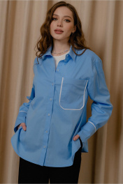 Молодежная рубашка (блузка) прямого силуэта, обьемной формы из ткани в полоску, с центральной застежкой по переду на планку. Со спущенной линией плеча, с рукавом до запястья на манжете с кантом в контраст, с застежкой на 2 петли и пуговицы, с воротником на стойке. Перед с накладным карманом на левой полочке с кантом по краю кармана в контраст. Спинка с кокеткой. Низ изделия фигурной формы, и разрезами в боковых швах. Длина 69 см, ширина по линии груди и талии 54, 56, 58, 60 см (42, 44, 46, 48 рр), ширина по линии бедер 53,5, 55,5, 57,5, 59,5 см. Длина рукава 64,5 см, длина манжеты 12 см.